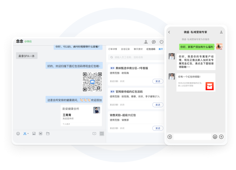 会话过程中接待人员可推荐员工名片,引导客户加好友;还可使用红包活码,客户加好友后自动发送专属红包
